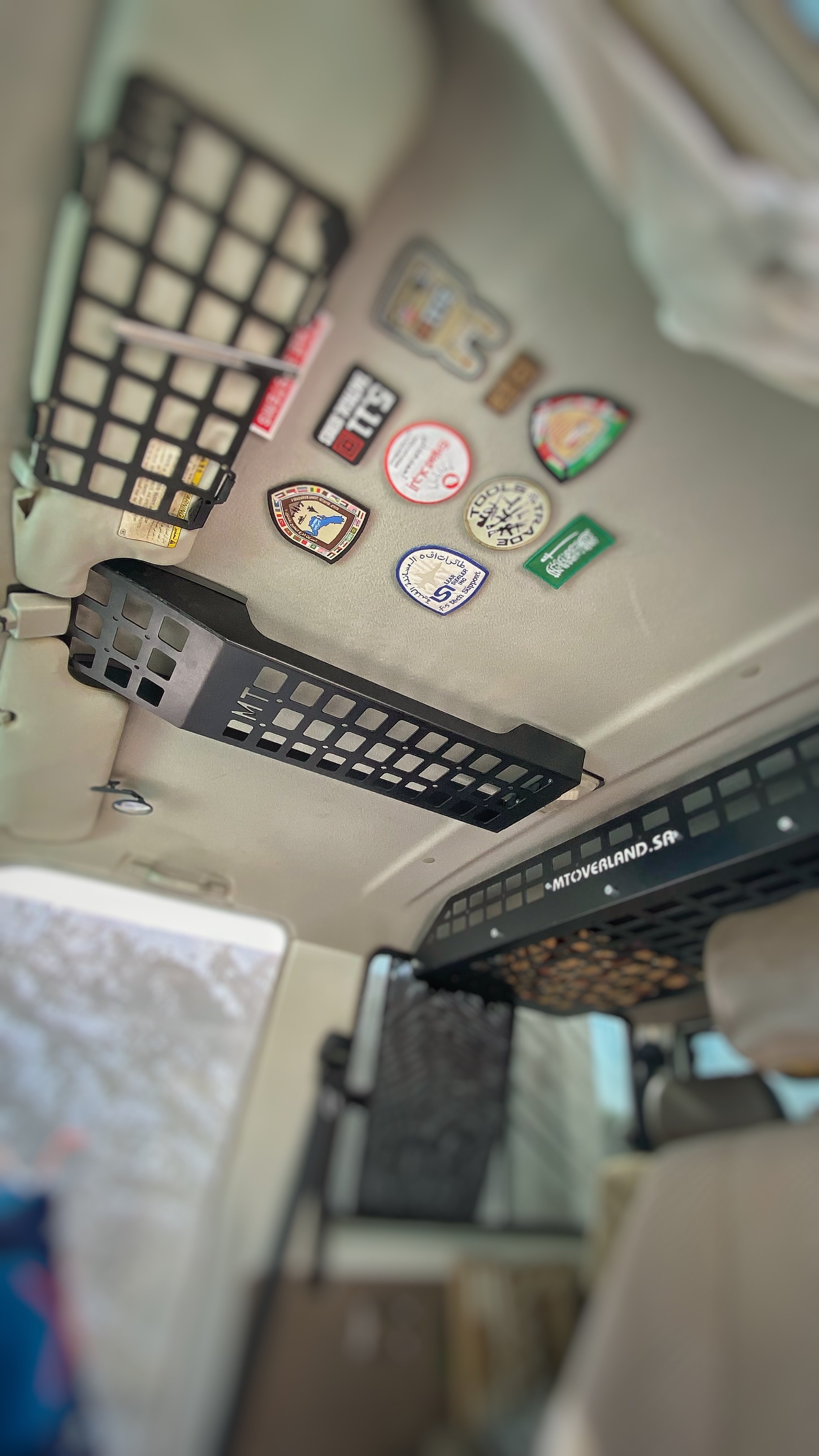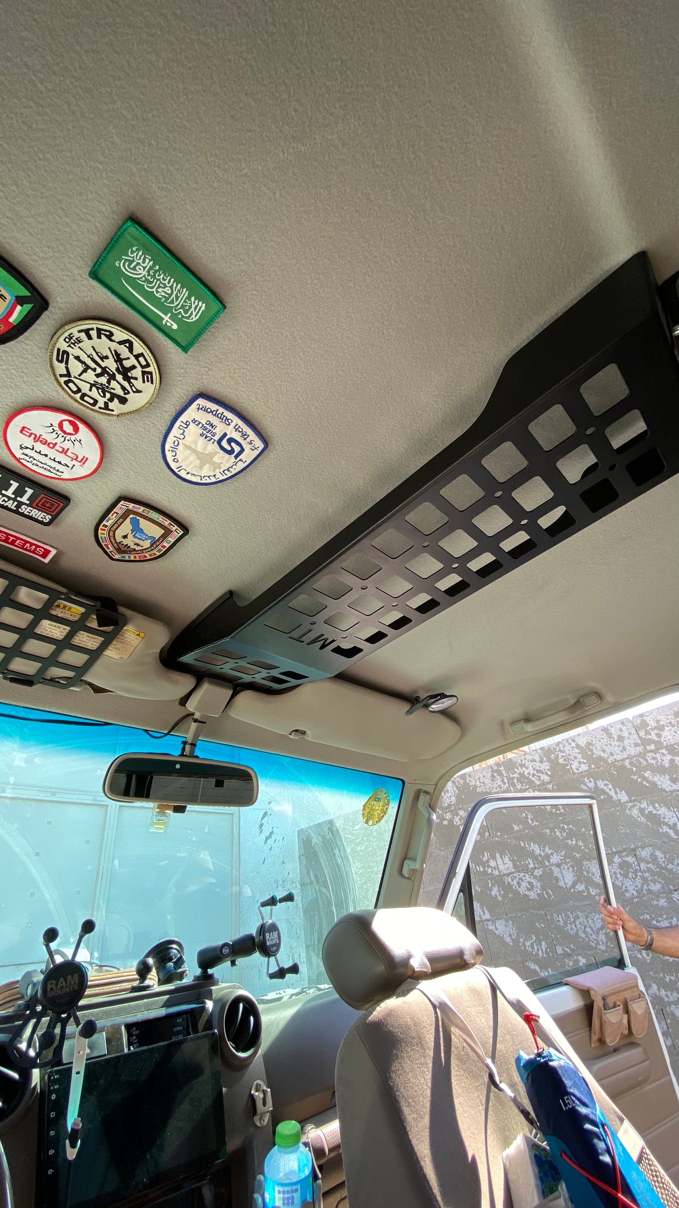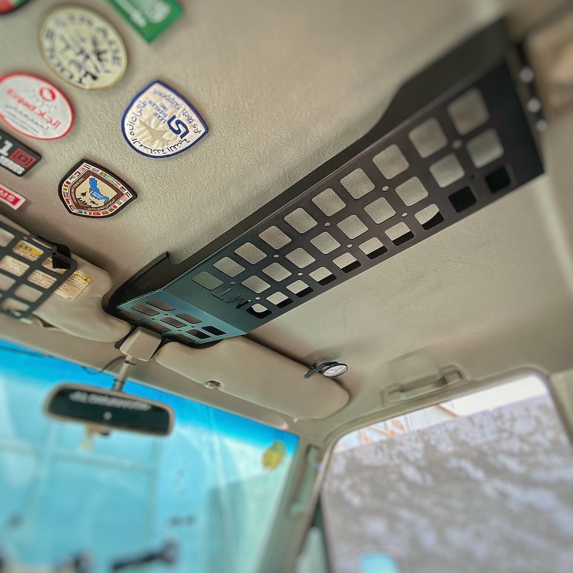 تم تصميم هذا المنتج لتوفير مساحة التخزين المثالية داخل السيارة و استغلال السقف بين مقعدي الراكب و السائق بذكاء للتنظيم و تسهيل الوصوف للاغراض بشكل اسرع. يمكن استخدام مولي السقف ك رف داخلي بالاضافة الى الاستفادة من نظام الMOLLE لتعليق المنظمات و الحقائب او الكشافات و ادوات الرحلات مثل الجهاز اللاسلكي و غيره . تم ثني اطراف المنتج لمنع الاغراض من السقوط في البر او الطرق الوعرة.