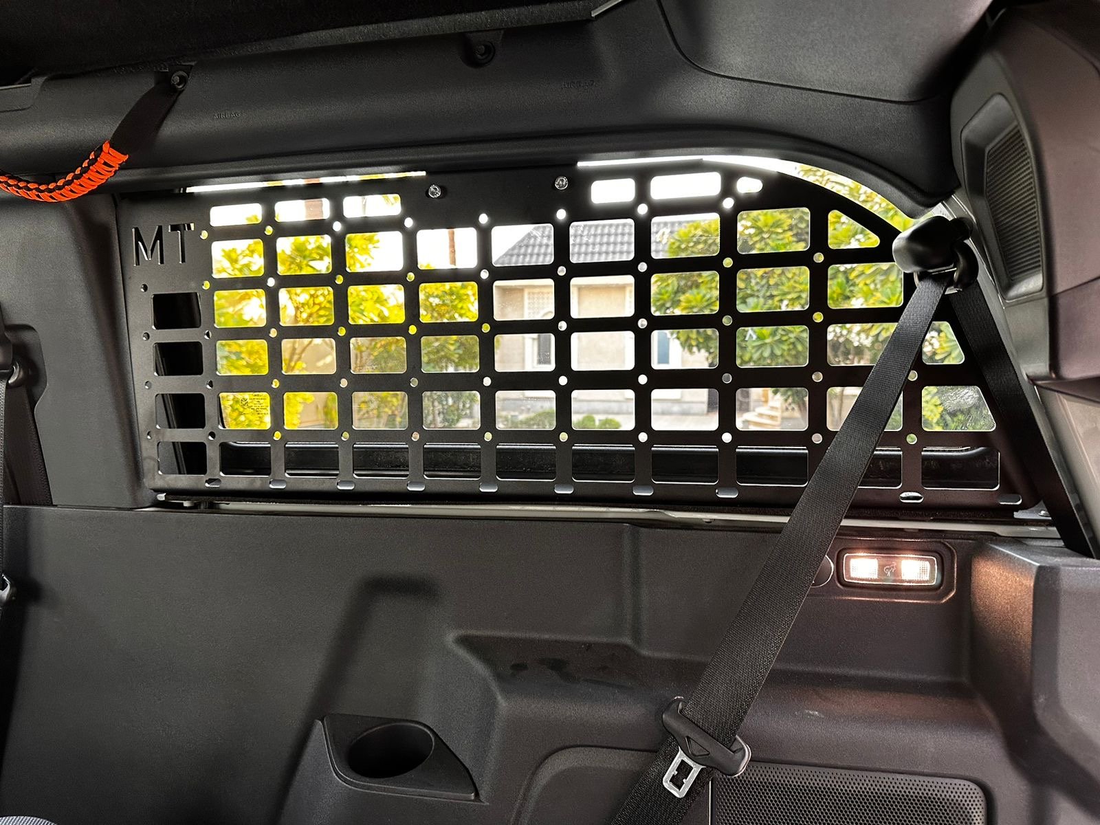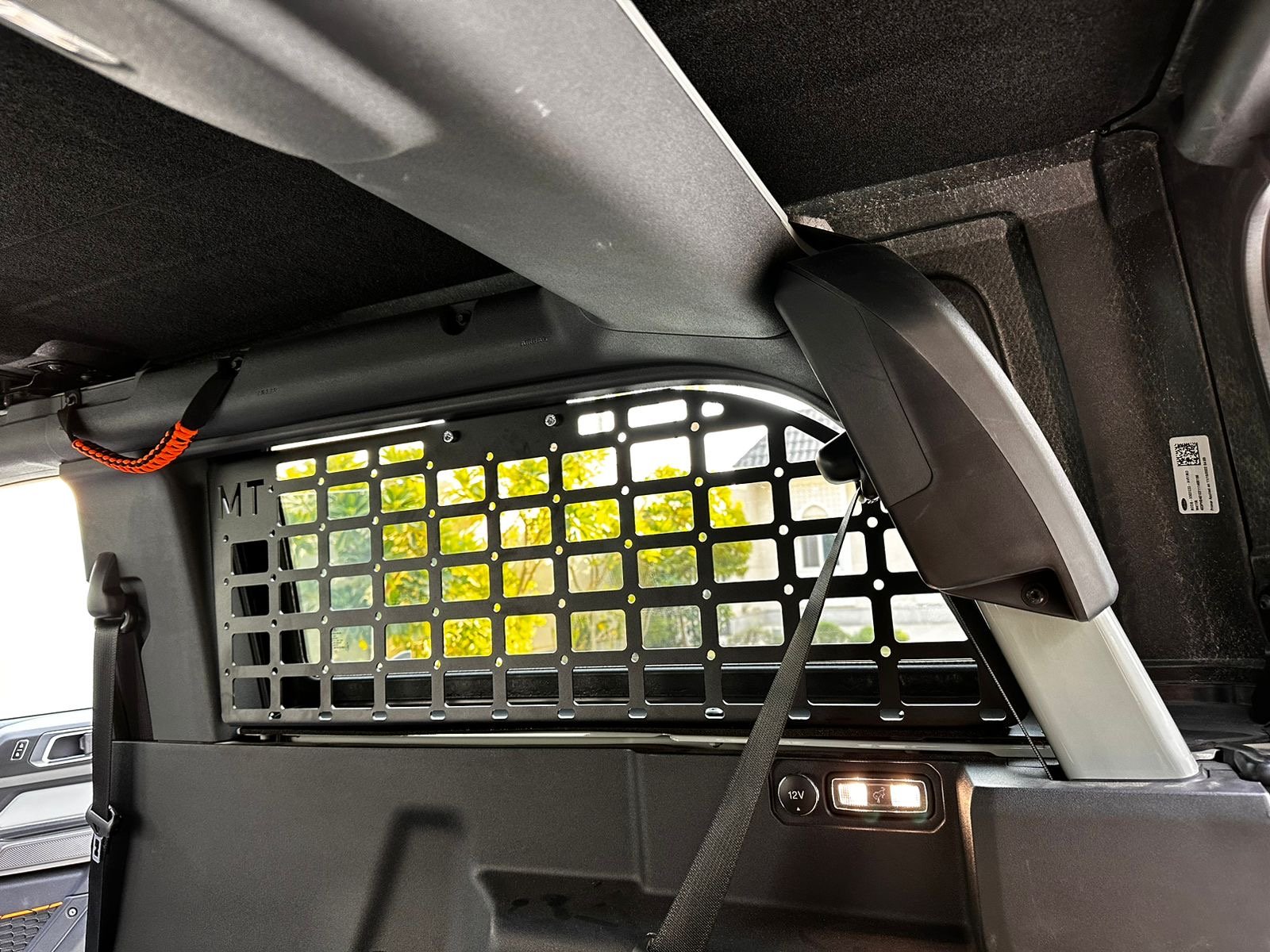 Ford Bronco 2 Doors Molle system helps to organize the trunk during trip , easy access for small bags ex: first aid, tools bag, etc.. , also keeps the windows protected.